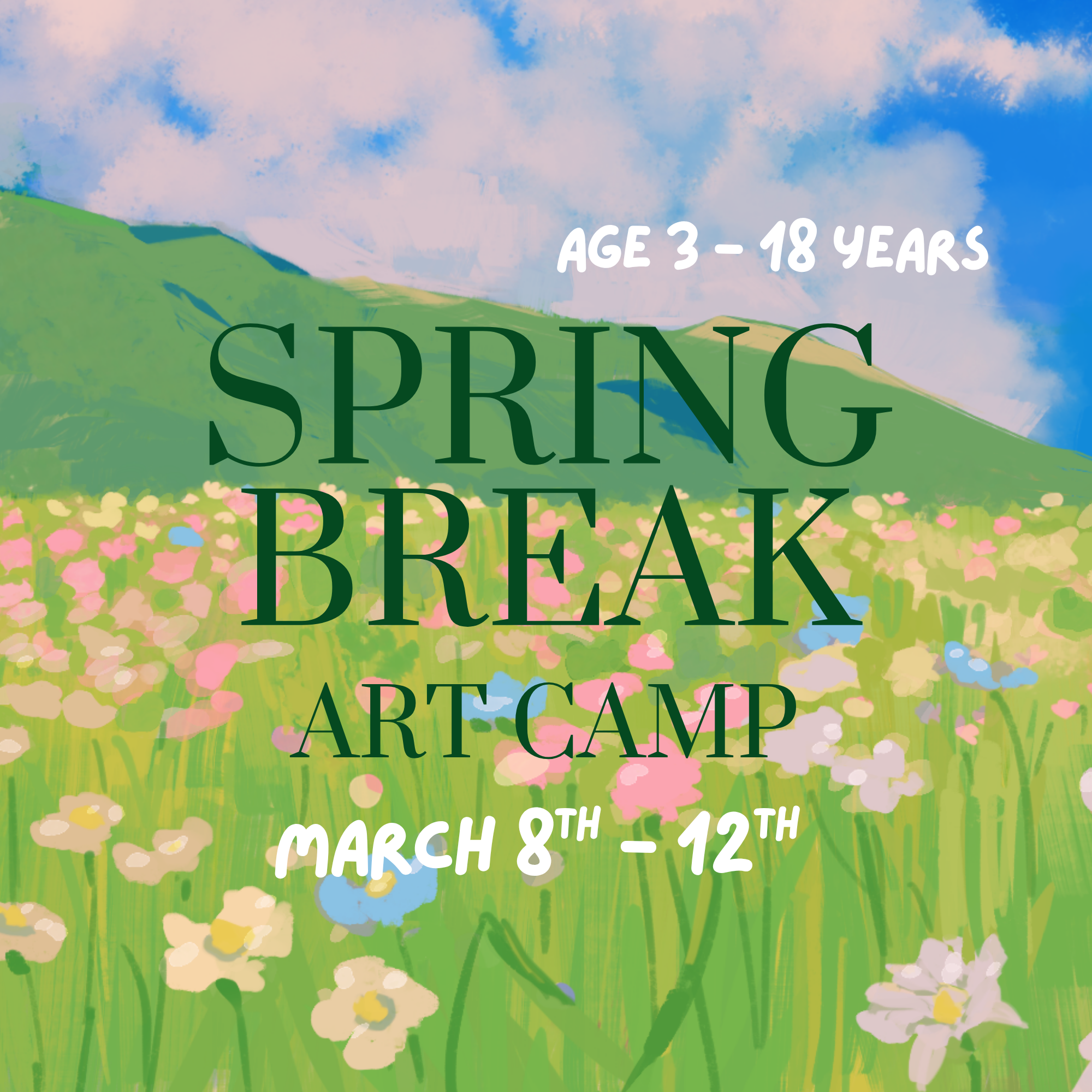 Make the most of spring break with creativity, color, and imagination! Our Spring Break Art Camp is the perfect way for kids and teens to explore different art mediums while having fun in a relaxed, inspiring environment. Students can choose from a variety of exciting projects—animals, cartoons, nature, and more—while learning step-by-step techniques using our signature grid method.