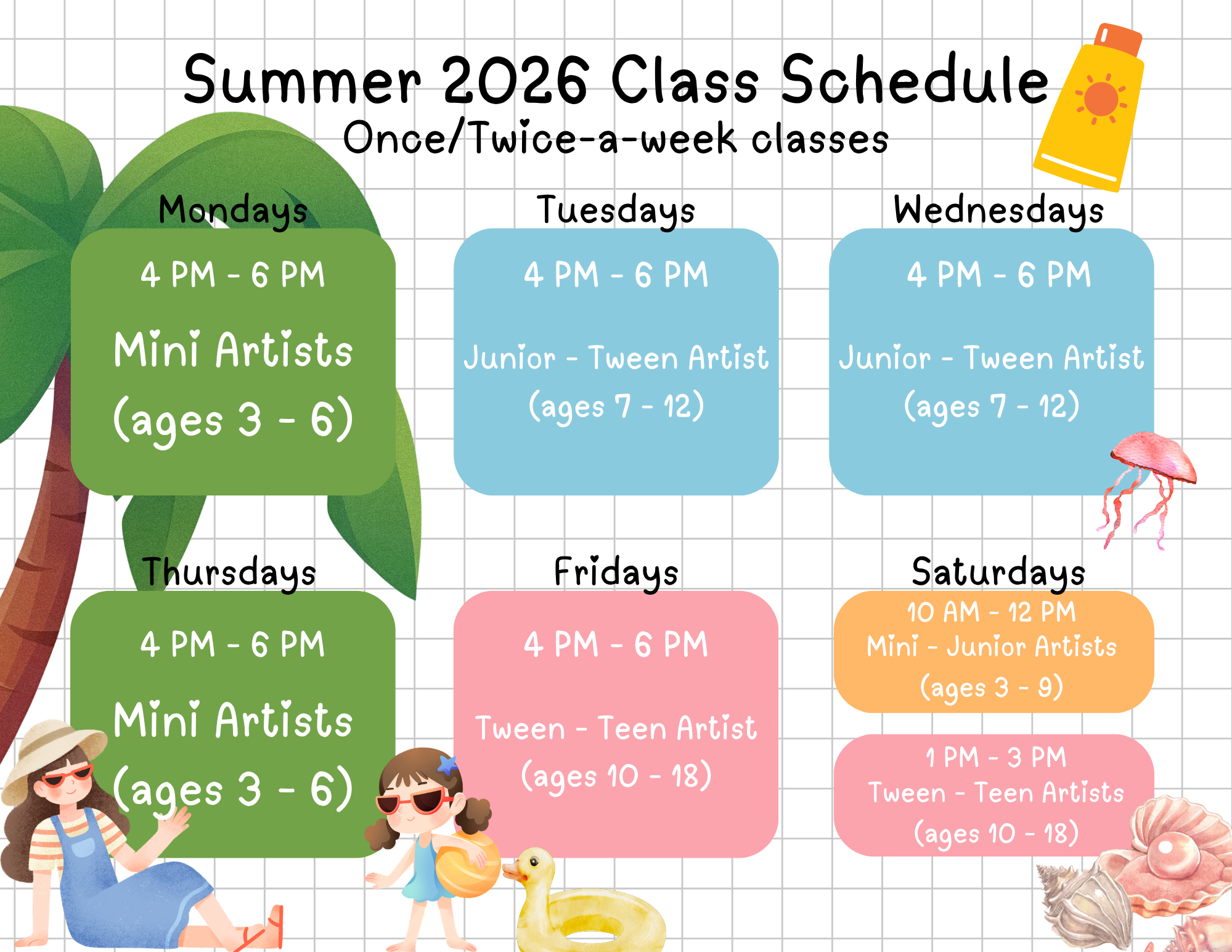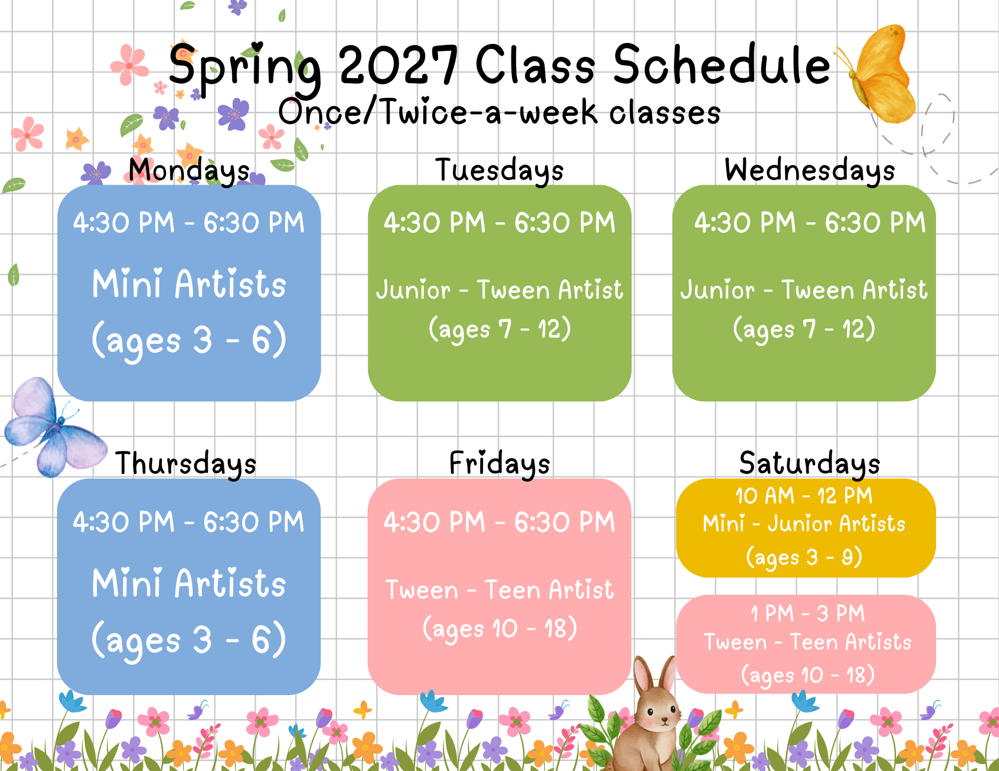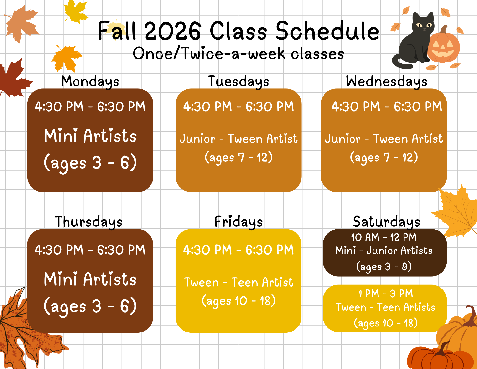 Classes meet once a week or twice a week and are designed to fit comfortably into busy schedules while giving students time to develop their skills and creativity.